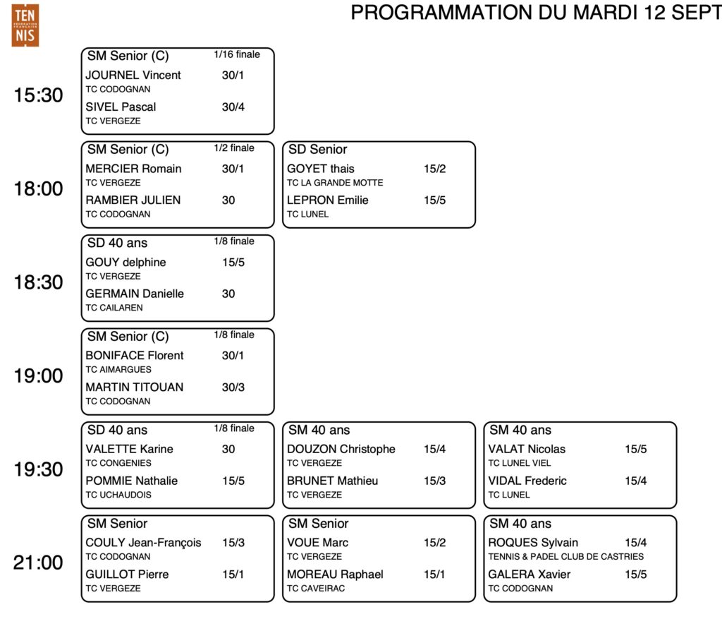Programme du 12 Septembretennisclubcodognan12/09/2023Tournoi du CTC, Tournois Le niveau monte … TweetezPartagezPartagezÉpingle0 Partages